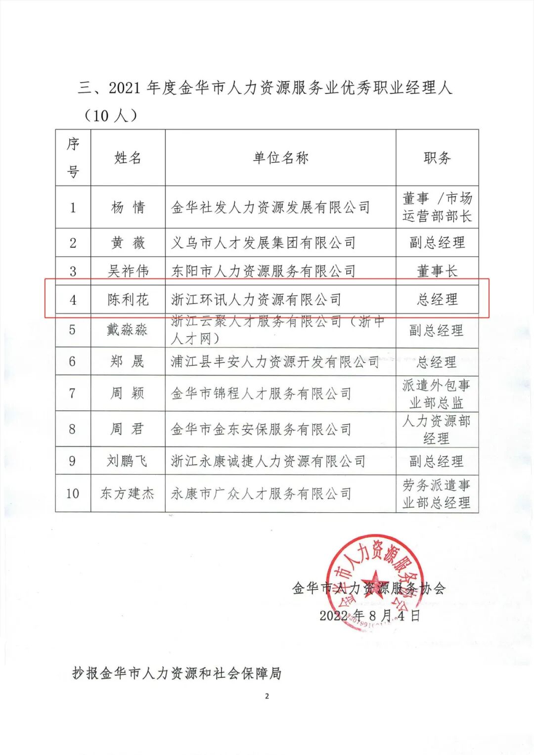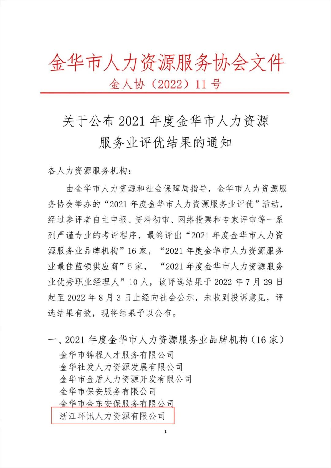 還有在近日,由金華市人力資源和社會保障局指導,金華市人力資源服務(wù)協(xié)會舉辦的“2021年度金華市人力資源服務(wù)業(yè)評優(yōu)”活動中,浙江環(huán)訊人力資源有限公司還被評為“2021年度金華市人力資源服務(wù)品牌機構(gòu)”,環(huán)訊人才網(wǎng)陳利花總經(jīng)理被評為“2021年度金華市人力資源服務(wù)業(yè)優(yōu)秀職業(yè)經(jīng)理人”!