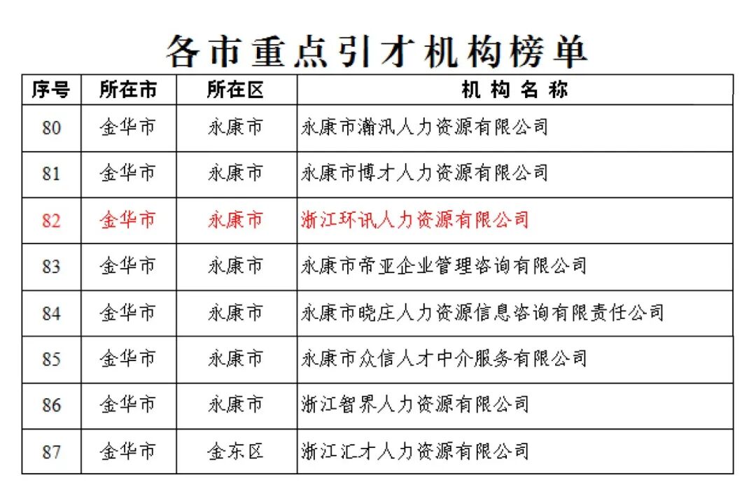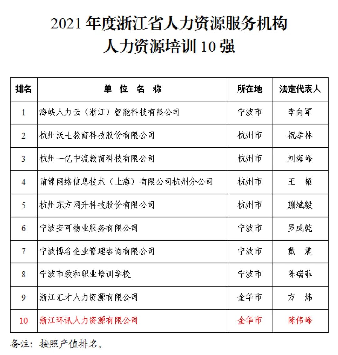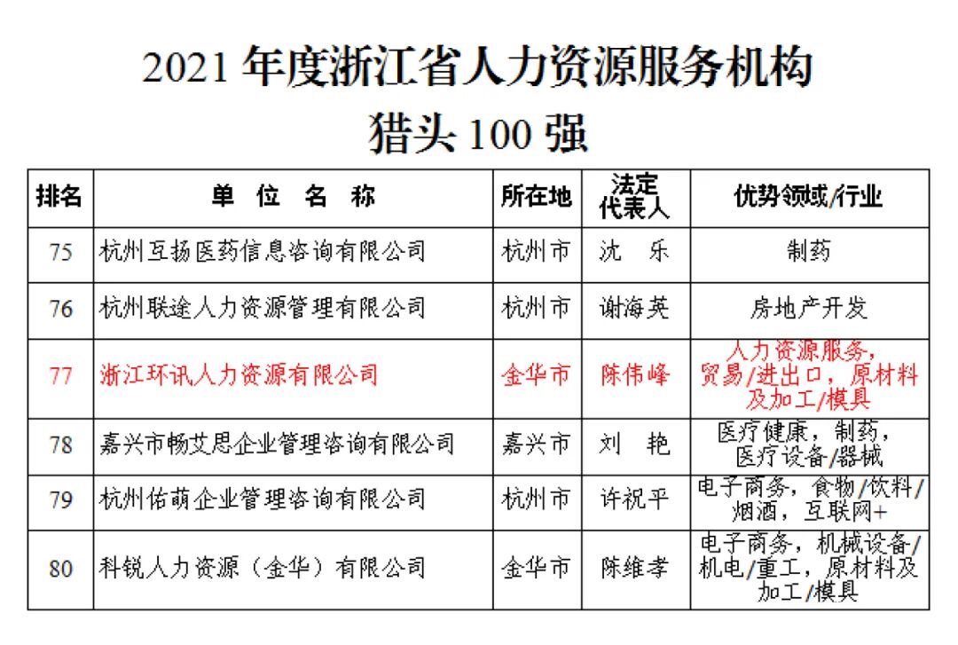 同時公布了《2021年度浙江省人力資源服務(wù)機構(gòu)綜合100強》等10份榜單。這是自2019年以來,浙江第4次發(fā)布人力資源服務(wù)業(yè)榜單。浙江環(huán)訊人力資源有限公司被評為“2021年浙江省人力資源服務(wù)機構(gòu)獵頭100強”,“2021年浙江省人力資源服務(wù)機構(gòu)人力資源培訓10強”等榮譽!
